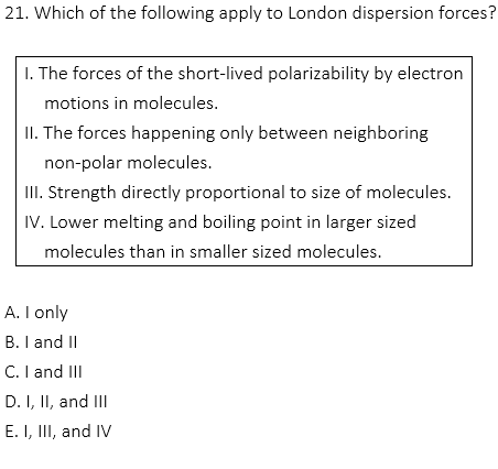London dispersion forces happen by the short-lived polarizability from electron motions between two neighboring polar or non-polar molecules. Strength and melting and boiling points are directly proportional to the size of molecules.